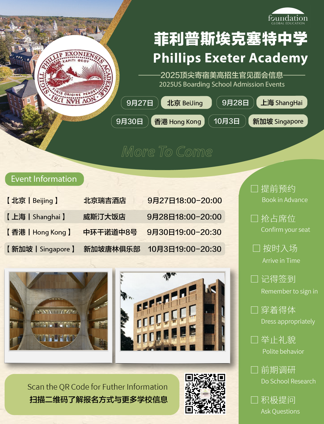 Phillips Exeter Academywill be hosting official admission information sessions in Beijing, Shanghai, Hong Kong, and Singapore this fall. Families will have the opportunity to meet directly with the school’s admissions representatives, learn more about Exeter’s academic and extracurricular offerings, and gain valuable insights into the U.S. boarding school application process. We are pleased to share this information so that interested families can attend.