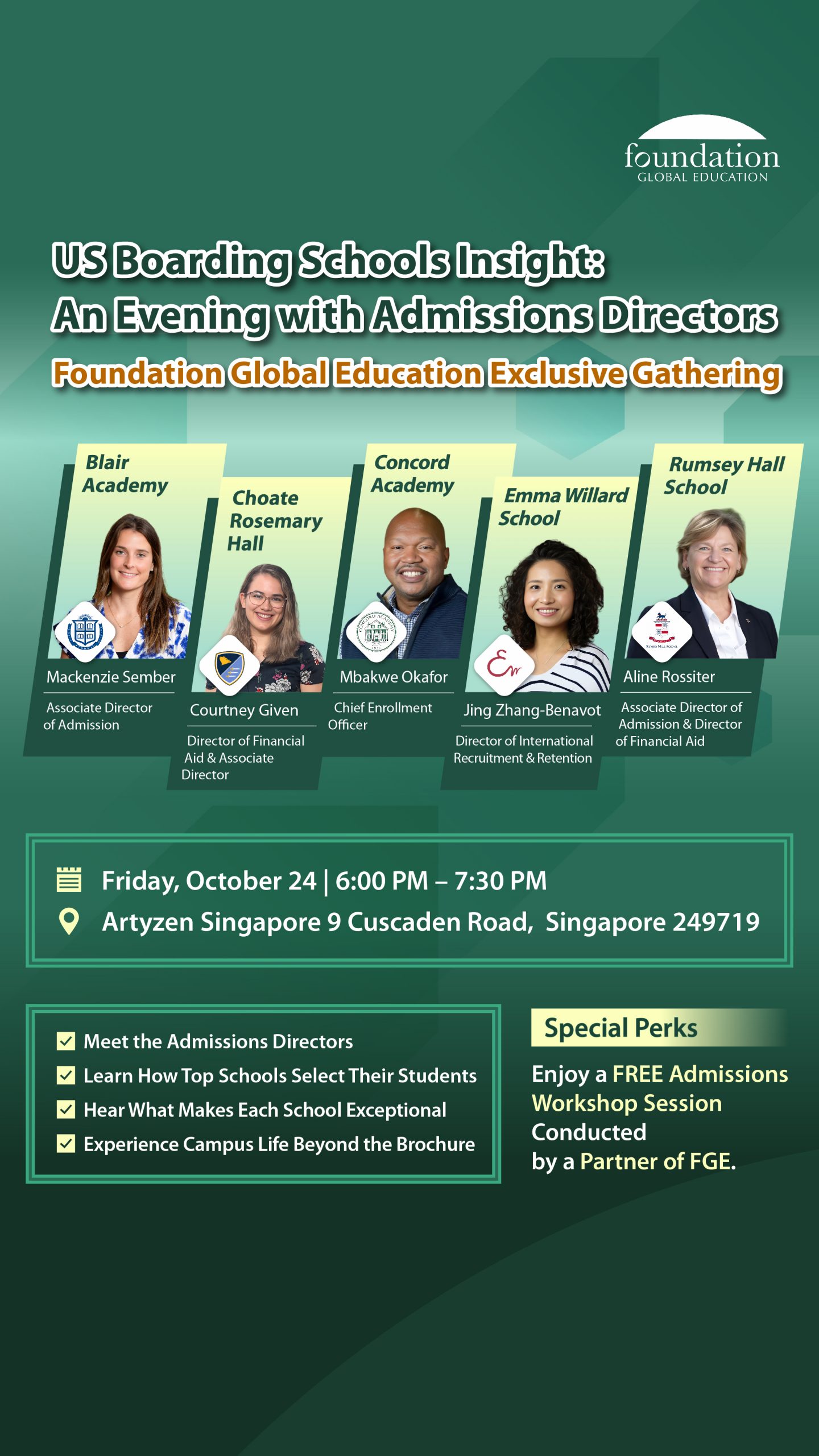 Join us for an exclusive in-person event hosted by Foundation Global Education, where families will have the unique opportunity to meet and engage directly with Admissions Directors from four top U.S. boarding schools.
