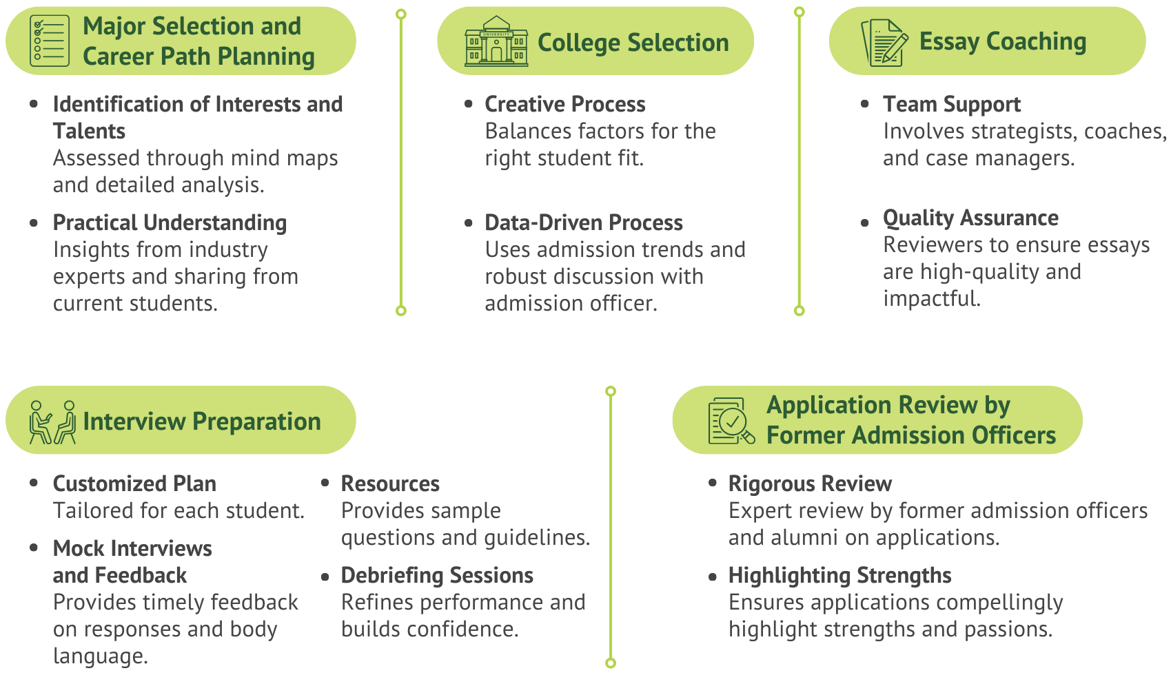 We work closely with students from Grades 9 through 12 on their college applications, empowering them to present themselves as strong candidates and future leaders ready to make an impact. Our approach combines a proven hands-on methodology with a personalized strategy tailored to each student's unique strengths and passions. By meticulously uncovering and nurturing each individual's potential, we provide targeted support that enhances their growth opportunities and helps them stand out in the college admissions process and beyond.