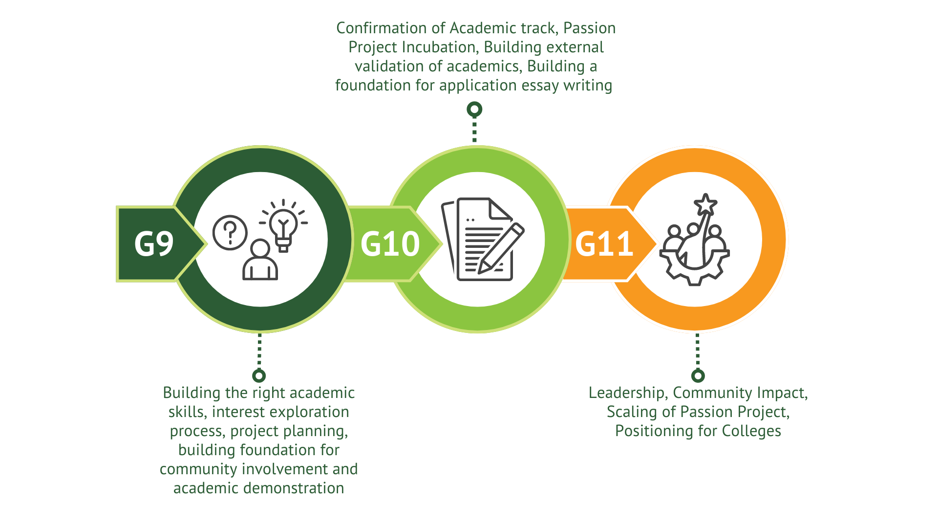 We help G9 students explore the resources at their school to understand what they can achieve within their immediate school community. We validate their potential tracks by entering students into competitions and recommending that they join programs like service trips during school breaks to delve deeper into their chosen areas.