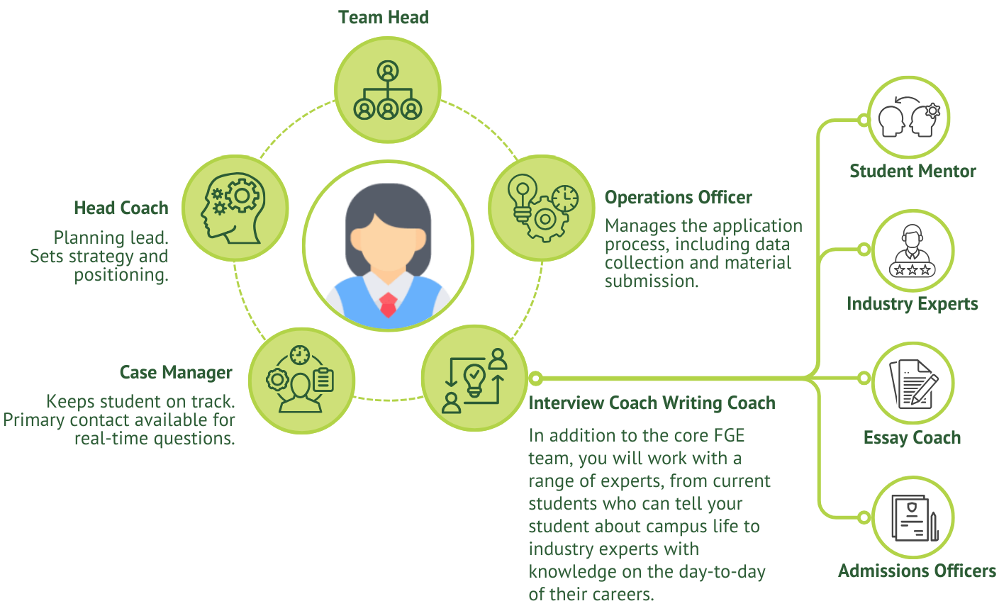 In our Application Module, we leverage our extensive knowledge of every global education system to set students up for success in the application process. Applicants have access to their core FGE team of two senior strategists, one head coach, and one case manager, as well as additional experts, including former admission officers and youth mentors who are current students or alumni of top-tier US universities.