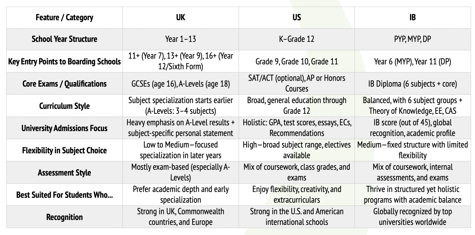 Understanding the structure and expectations of the UK education system is essential for families considering boarding school admissions. With multiple entry points, assessment requirements, and curriculum differences, navigating these options can feel overwhelming, especially when comparing with the U.S. system or the International Baccalaureate (IB).