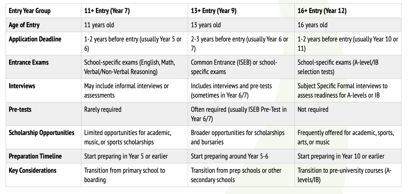UK boarding school applications typically begin 1–2 years before entry, depending on the age group: